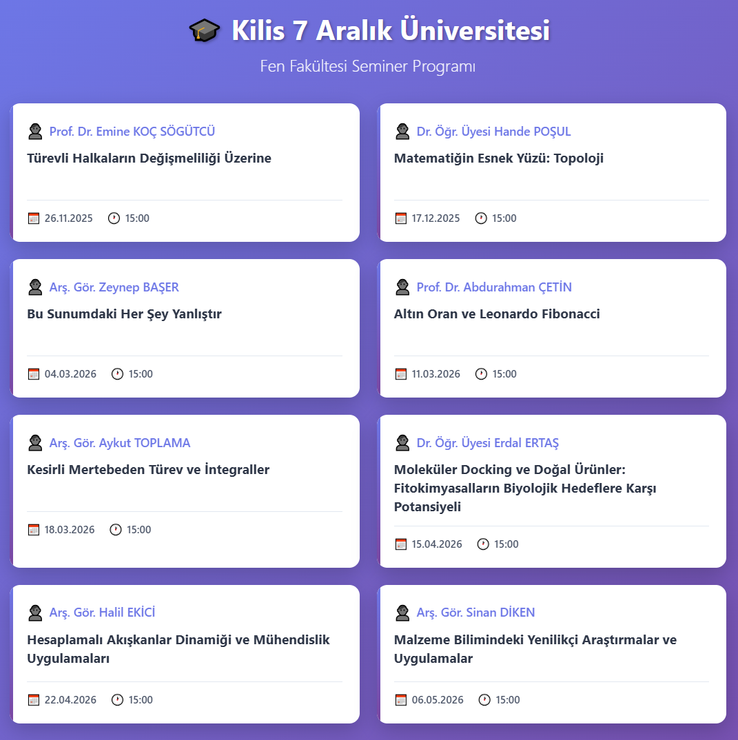 2025-2026 Eğitim-Öğretim döneminde Çarşamba günleri Fakülte Seminer Günü kapsamında bölümlerimize ait Seminer Takvimleri aşağıda yer almaktadır.