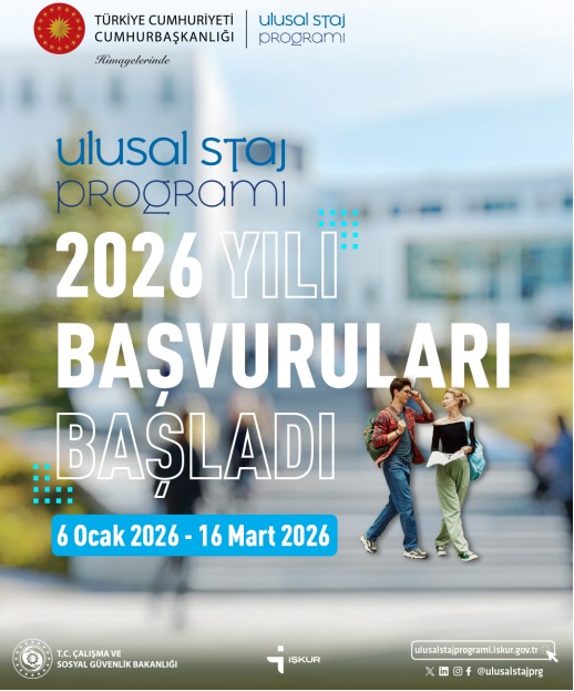 Çalışma ve Sosyal Güvenlik Bakanlığının, Yükseköğretim öğrencilerinin kamu kurumları ve özel sektör kuruluşlarınca sunulan erken dönem kariyer imkânlarından fırsat eşitliği ve liyakat esaslarına uygun olarak faydalanmasını sağlamak amacıyla 2020 yılından bu yana yürütülen Ulusal Staj Programı 2026 yılı itibarıyla Cumhurbaşkanlığı himayelerinde Türkiye İş Kurumu Genel Müdürlüğü tarafından yürütülecektir. Program başvuruları 6 Ocak-16 Mart 2026 tarihleri arasında https://ulusalstajprogrami.iskur.gov.tr. adresi üzerinden alınacaktır.