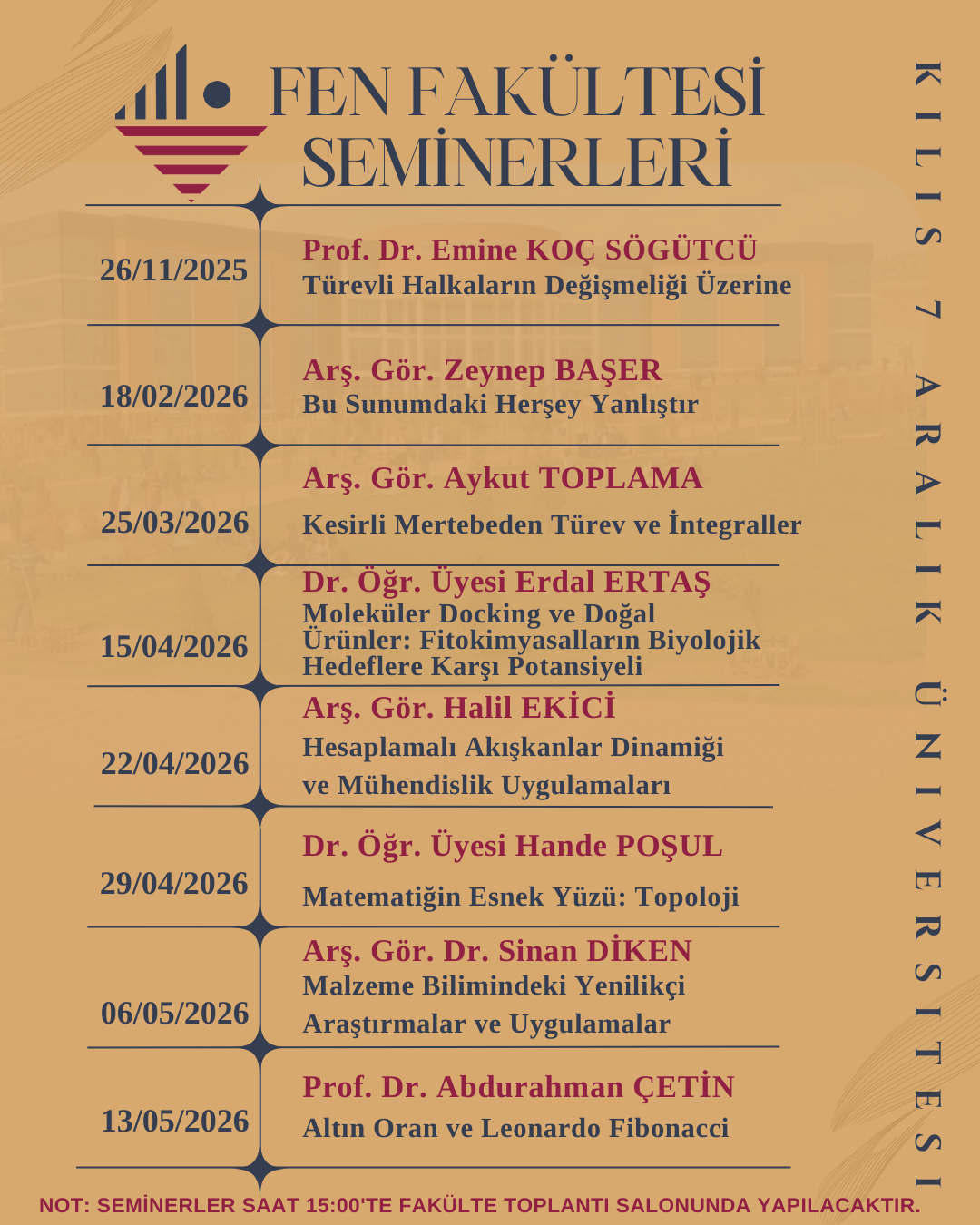 2025-2026 Eğitim-Öğretim döneminde Çarşamba günleri Fakülte Seminer Günü kapsamında seminerler düzenlenecektir. Bölümlerimize ait seminer takvimi aşağıda sunulmuştur.