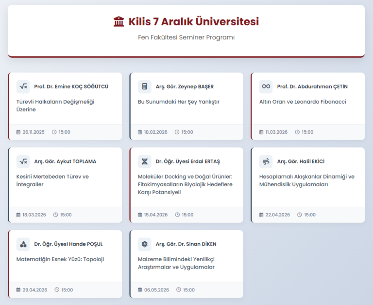 2025-2026 Eğitim-Öğretim döneminde Çarşamba günleri Fakülte Seminer Günü kapsamında bölümlerimize ait Seminer Takvimi aşağıda yer almaktadır.